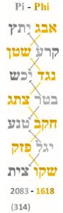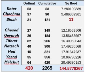 Utilizing the spelling Gimmel (גמל) we see that all the Names of the 22 Letters are found within Words of the Torah a total 13765 times.  Nonetheless, when we apply the complete gematria of that set of 22 Names to the full 304805 Letters in the Torah we get an average of precisely (59431232/22) = 2701420, as in the 2701 value of the 7 Words of the First Verse of the Torah, the 73rd Triangular Field, and the 73-value of the Name Gimmel (גמל) coupled with 420 obviously, while its ordinal value is 28, as in the 28 Letters of that same First Verse. While the Logarithm of 59431232 is 7.77, there are 420 YHVH (יהוה) through the 10 Commandments, and there are 420 cycles of Primal Frequency (27.5) in the Spherical Time Paradigm Event Horizon diameter, 11,556 years.  Furthermore, the ratio of the complete value of the 22 Names of the Letters to the standard value of those 22 Letters for the entire 304805 Letters of the Torah is (59431232/21009826) = 2.82873…, which is phenomenally also nearly exactly the square root of 8, or 2.82842… like the 79976 Words of the Torah, whose square root is Ö79976 = 282.8002828, while the complete value of the 22 Names divided by 8 is 620.375, as in 620, Keter.