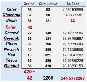 From the 3342 value of the 42 Letters of the 11 Sefirot of the Outer Tree-of-Life, its’ 11 Names expand into the 111 Letters of 42 Names that have a value of 9047. If instead we calculate this expansion with the Gimmel (גימל) – Chet (חת) configuration, the total is 9027 with an ordinal value of 1260, as in (30 x 42) and as in the 12600 value of the 26 ages of the 26 Generations of Adam, and as in the 126-value of each of the 9 planes of the 27 positions of the normal Magic Essential Cube of Creation of Constant 42. The Sofit value of those same 111 Letters of the 42 Names is 15937, with an ordinal value of 1375, as in the (50 x 27.5) value of the bottom 3 Tiers of the 42-Letter Name Matrix.  Obviously 111 is the value of Alef (אלף), but less obvious is that over the first two expansion Tiers the total is (42 + 111) = 153 Letters while the first string …111… within Pi (π) is at digit #153. These were all calculated with the standard Names Gimmel (גמל) and Chet (חית), yet if we shift to the alternative spelling by shifting the Yud (י) to the Gimmel (גימל) from the Chet (חת) for the next expansion the standard value becomes exactly 18,000, and if we wait and make the shift after that expansion, the following expansion Tier becomes exactly 42,000. While, we cannot know for sure why the Creator designed them this way, we must keep in mind that of the first 1,000,000 possible positive integers, only 1000 can work out so precisely and of those only 50 or so would we deem as significant alignments, and only 42,000 is 1000 times the number of Letters in the Outer Tree-of-Life, thus increasing their connection to the Source of 42.