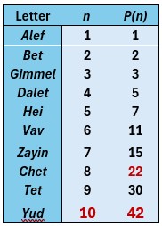 And while the p(6) = 11 for the Letter Vav (ו) represents the 11 Essential Triplets of Creation, and the p(7) = 15 for the Letter Zayin (ז) represents the 15 Essential Triplets of the Shema, and the p(10) = 42 for the Letter